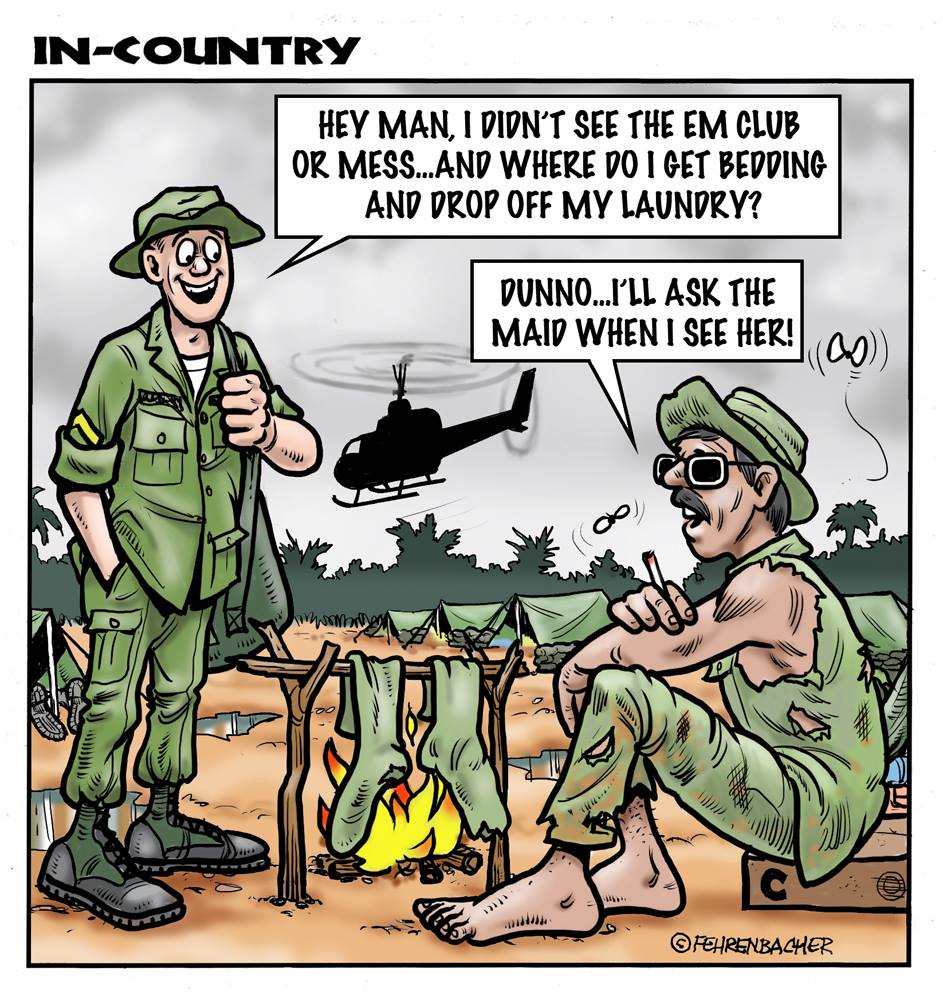 Phil enlisted in the Army in 1965 where you served for years in Vietnam.  He became a graphic designer and has worked for the state of Oregon for 26 years.  He retired in 2003 and started the Cartoon "In-Country".  The cartoons reflect his experiences during his tour of duty in South Vietnam.